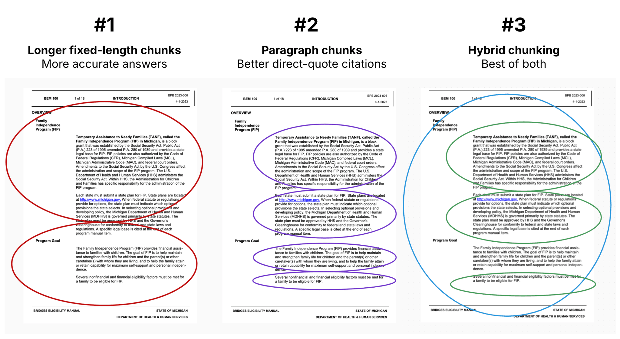 Through our prototyping process, we experimented with a progression of three approaches to breaking source reference material into chunks, which we then passed to our LLM in order to create chatbot answers.