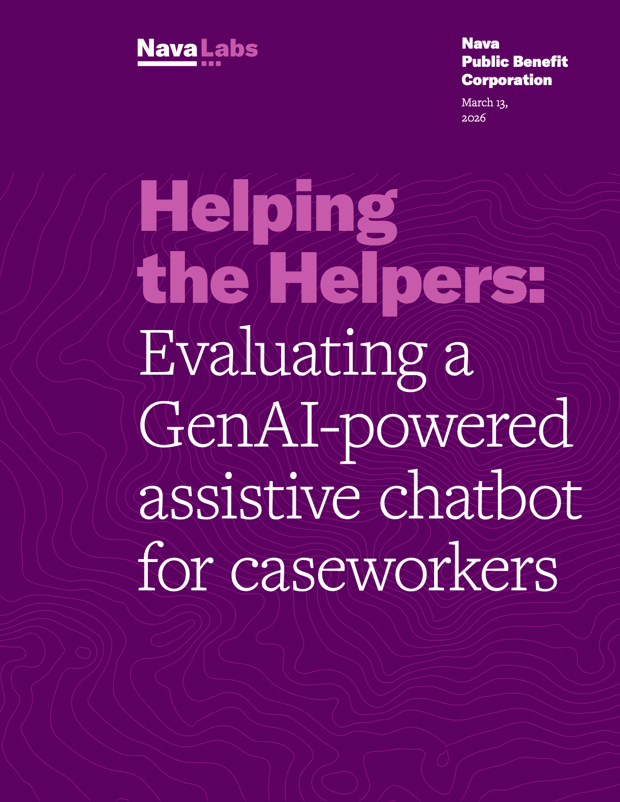 The report authors would like to acknowledge members of the Nava Labs team: Alicia Benish, Charlie Cheng, Diana Griffin, Foad Green, Genevieve Gaudet, Kanaiza Imbuye, Kasmin Scott, Kevin Boyer, Ryan Hansz, and Yoom Lam for contributing to the development and implementation of the pilot and evaluation plan; Bob Wilkinson, Chloe Hilles, Greg Jordan-Detamore, and Noam Leead for design and communications support; members of the Amplifi team: Jill Bauman, Brit Gilmore, Karen Van Kirk, and Ryan Fendy, for partnering on the real-world pilot implementation and recruiting caseworkers for the advisory council and pilot participation; and the 12 members of the caseworker advisory council and the over 60 caseworkers who participated in the pilot from various human services agencies and nonprofit organizations in Los Angeles and who provided invaluable insights about the experience using the chatbot.