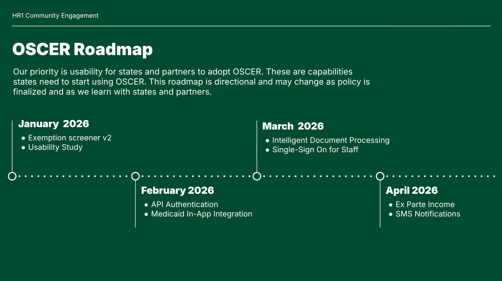 Our priority is ensuring OSCER is highly usable for states with minimal integration effort. So far, we’ve focused on addressing the biggest eligibility bottlenecks with the lightest integration lift. As we learn more about the policy implementation and work directly with states, we’ll update our roadmap.